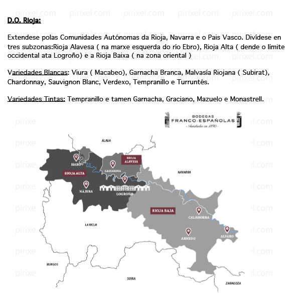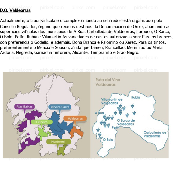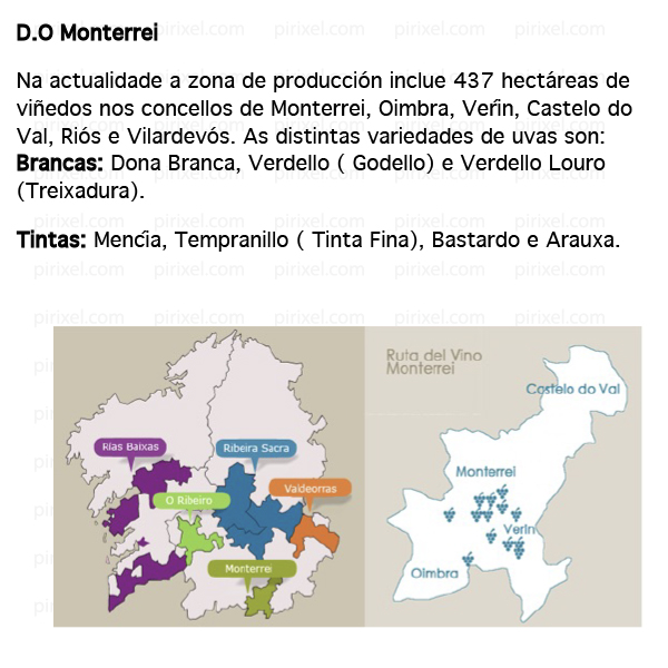 WINERY D.O. MONTERREI WHITE WINE SETEMBRO godellotreixaduraalbariño PEIXES BRANCOSMARISCOSENSALADASARROCES 16,50€ ALTO DO BOCELO godellotreixadura dona branca 16,70€ RED WINE CREGO E MONAGUILLO mencia 16,00€ FATHER mencia arauxa6 meses barrica roble 29,95€ SETEMBRO mencía 16,50€ D.O. RIAS BAIXAS WHITE WINE SEÑOR DA FOLLA VERDE 70% albariño 15% treixadura 15% loureira MARISCOS PEIXES AFUMADOS PEIXES BRASA 22,00€ MAS QUE 2 albariñotreixaduraloureiro MARISCOSPEIXESARROCES 18,50€ ALBANTA albariño4 meses sobre lias MARISCOSPEIXESARROCESAVESQUEIXO FRESCO 16,50€ D.O. RIBEIRA SACRA WHITE WINE FINCA CUARTA godello 18,50€ REGINA VIARUM godello PEIXES BRANCOSARROCES CON MARISCOSPOLO BRASA 18,00€ RED WINE DEMO mencía 18,00€ PEZA DO REI 90% mencía2% merenzao3% tempranillo2% sousón3% garnacha PEIXES AZUISCARNES BRANCASCARNES ROJAS BRASA 19,00€ D.O. RIBEIRO WHITE WINE MAL RAIO TE PARTA 60% albariño25% godello15% lado 18,50€ A FLOR E A ABELLA treixadura 17,50€ RED WINE CUÑAS DAVIA 35% cailño longo35% brancellao15% sousón15% mencía 34,50€ D.O. VALDEORRAS WHITE WINE DONA DELFINA godello 16,50€ VOAR godello 17,50€ VOAR SOBRE LIAS godello 25,00€ A COROA godello 18,25€ RED WINE MIL RIOS garnacha 26,00€ BANCALES mencíasousónalbarello6 meses en barrica 16,00€ DOMUS sousónmencía12 meses en barrica 22,50€ FLAVIA mencíatempranillo 13,50€ VALDOURO mencíagarnacha 14,00€ D.O. VALDEORRAS ESPUMOSOS BRINDE DE ROANDI godello 15,00€ BRINDE DE ROSAS mencíaalbarellosousón 14,00€ D.O. CAVA CANALS NADAL 45% macabeu40% xarel-lo15% parellada 12,00€ D.O. RIOJA MONCHO O VASCO tempranillo graciano garnacha 15,50€ PIÉROLA tempranillo18 meses en barrica 18,00€ LOPEZ DE HARO tempranillogracianogarnacha 13,50€ SEÑORIO MENDIETA RVA. tempranillo 16,00€ UGALDE tempranillogarnacha 15,00€ D.O. RIBERA DEL DUERO CARRAMIMBRE CRIANZA 90% tinta país10% cabernet sauvignon GUISOS DE CARNEEMBUTIDOSCARNES ROJAS 22,00€ DIEGO RIBERA ROBLE tempranillo TODO TIPO DE CARNESARROCES 16,00€ FINCA RESALSO tempranillo CARNES BRANCASEMBUTIDOS 18,00€ D.O. TORO VATAN 2019 tinta toro GUISOSPRATOS DE CAZAESTOFADOS 39,40€ VETUS tinta toro CARNES VERMELLASLEGUMESQUEIXOS BRANCOSCAZA 24,00€